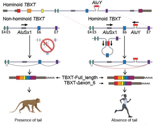 Fig 1. Pulled from the Xia et al. article (linked at the end of this paper). The hominoid TBXT gene is affected by the Alu loop created by AluSx1 and AluY, resulting in an alternately spliced transcript that lacks exon 6. Tailed primates lack the AluY element, exon 6 is transcribed, and an external tail results.