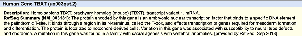 Let's use the Genome Browser as another way to visualize this genetic change. Figure 2 shows an image of the TBXT gene in its entirety. Figure 3 is the TBXT details page that can be displayed by clicking on the gene. Reading through the "Refseq Summary" reveals that TBXT plays an important role in helping to transcribe genes during mesoderm formation; The mesoderm germ layer of the embryo goes on to form the skeletal system of the fetus. The description also states that mutations within this gene are associated with chordoma, a cancer that affects the spine, and neural tube defects. This gene is obviously essential in the development of a healthy spine.