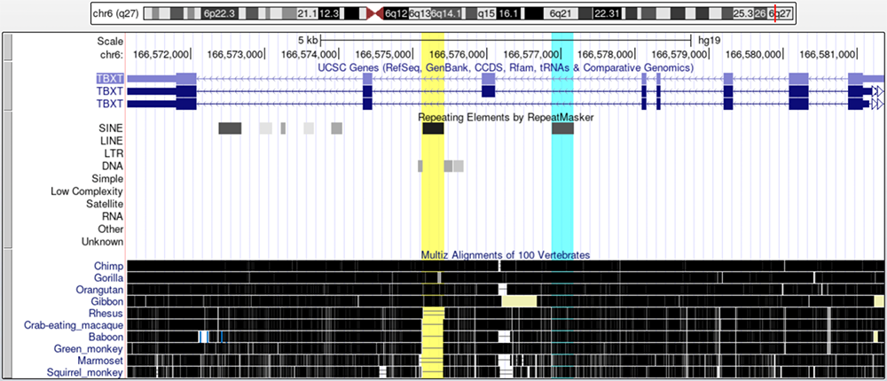 Turning on the RepeatMasker track reveals transposable elements on the gene, including Alu elements (which are marked within the "SINE" line of the track). Figure 5 displays the TBXT gene with the RepeatMasker track set to full. The yellow highlighted column marks the hominoid AluY element, while the turquoise highlighted column indicates the primate AluSx1 element. These two Alu elements flank exon 6, which is boxed in red. When TBXT undergoes transcription, these two Alu elements connect to one another creating a loop that stops exon 6 from being included in the mature transcript. In fact, the third transcript in the UCSC Genes track appears to be derived from transcripts that have eliminated exon 6.