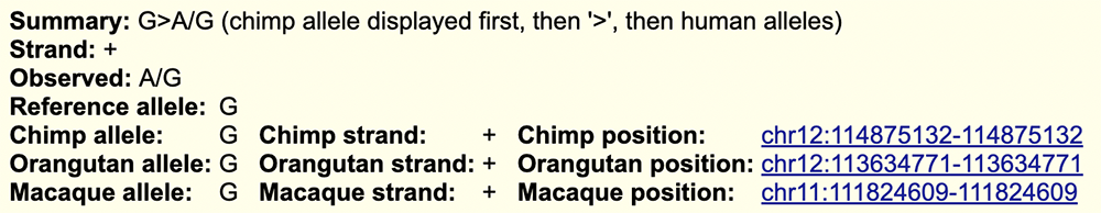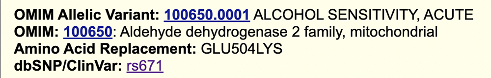 Clicking into the variant'ls link in the OMIM track will lead you to another details page (Figure 9). This page labels the variant as being associated with "acute alcohol sensitivity." It also provides the "Amino Acid Replacement" consequence of having the derived allele, A, rather than the ancestral or wildtype allele, G; Instead of possessing the codon GAA which corresponds to the amino acid glutamate, an individual with this mutation will have the codon AAA, which codes for a lysine amino acid (GLU540LYS). This phenomenon is referred to as a missense variant, or an allele change that encodes an altered polypeptide chain and results in a flawed protein; This explains why having the derived allele, A, results in acetaldehyde dehydrogenase enzymes that do not properly process acetaldehyde.