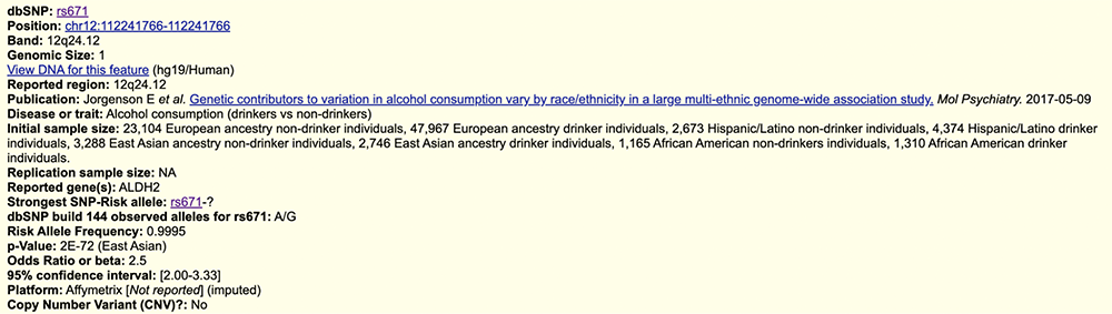 While the dbSNP track illuminated which allele is the derived (A) and which is the ancestral (G), imparting an assumption that the A allele results in alcohol flush syndrome, there are other tracks that can corroborate this and provide more information about the phenotypic consequences of the derived allele. GWAS, or the "Catalog of Published Genome-wide Association Studies", is a track that displays publications discussing phenotypes associated with a variant/rsID. Turning the GWAS track on while viewing ALDH2 shows that they also have data regarding rs671 (Figure 6).
