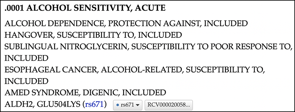 One missense variant, labeled rs671 (Figure 4), is the variant that causes "alcohol flush syndrome," a condition seen in approximately 30% to 50% of East Asian individuals (A smaller rsID number corresponds to an earlier entry, meaning that rs671 is one of the earliest uploaded into the database). This single nucleotide change creates an acetaldehyde dehydrogenase deficiency, meaning that alcohol consumption can result in a buildup of acetaldehyde that the body cannot process fast enough, resulting in acetaldehyde poisoning. The principal symptom of acetaldehyde poisoning is flushing, or erythema, on the face and body.