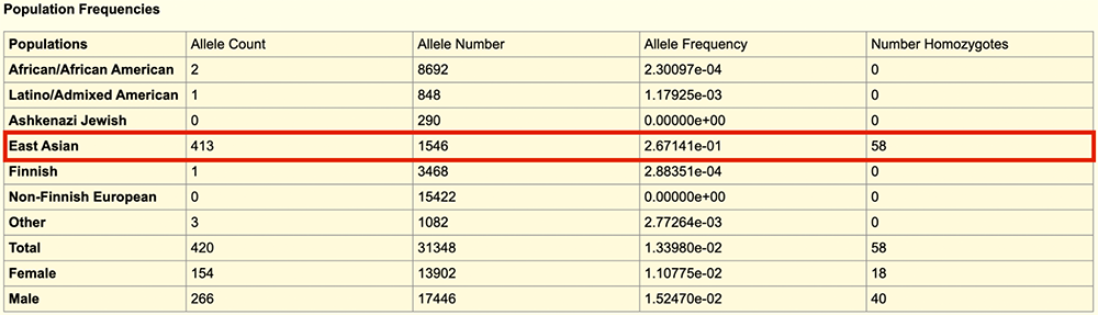 Clicking into the orange box will take you to gnomAD's details page for this variant (Figure 14). Here, we can see a variety of different populations and their allele frequencies for the rs671 position. Boxed in red are the data regarding "East Asian" populations. As one can see under the "Allele Frequency" column, East Asians have the highest allele frequency (26.7%) compared to the other populations, which are quite low. "Latino/Admixed American" populations have the second highest frequency (0.1%), after "Other"; This may be because the first peoples to populate the Americas crossed over the Bering Strait from Asia, springing some genetic similarities.