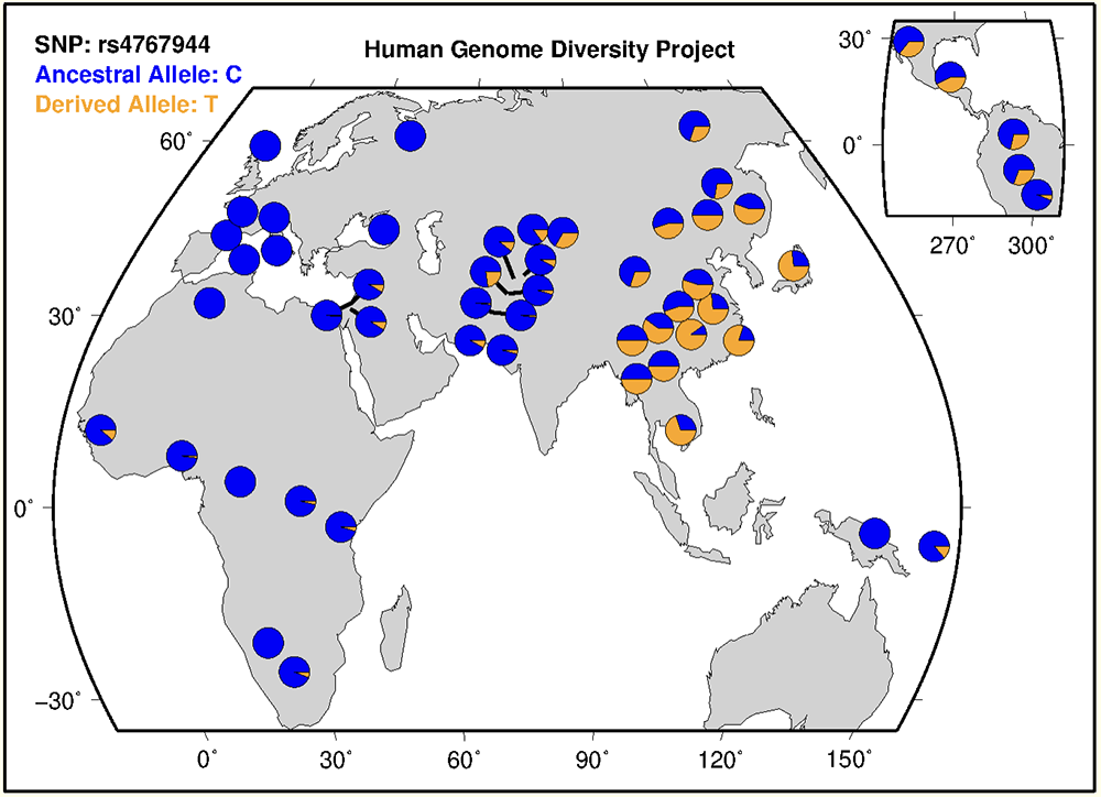 Clicking into the HGDP marker for rs4767944 will take you to its details page, which includes the image in Figure 17. This image provides a visual representation of the distribution of allele frequencies for this variant. As one can see, the derived allele (T) is found primarily in populations in East Asia and some populations in Northern Asia. It is also observed in some populations in South America (upper right corner). The rest of the world'ls populations exhibit high frequencies of the ancestral allele. Using this data, one can infer that rs4767944 most likely cosegregates with rs671, the causative allele of alcohol flush syndrome.