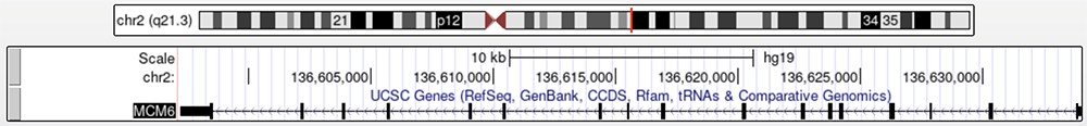 Figure 1b. The MCM6 gene in relation to the LCT gene.