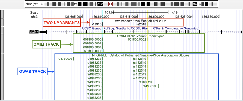 Figure 2a. MCM6 with two highlighted variants. A custom track labeled "two variants from Enattah etal 2002" show the coordinates, relative to the translation start of the LCT gene, of the variants in question. The "OMIM" and "GWAS" tracks are found below the "UCSC Genes" track, in respective order.