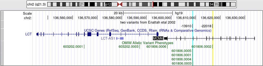 The Enattah et al. 2002 paper mentions the two variants we will be exploring. The "two variants from Enattah etal 2002" custom track (Figure 2) marks where the SNVs lie on MCM6. The turquoise highlighted vertical line crosses through the -13910 C/T allele change in intron 13 on MCM6 mentioned in the paper. The yellow highlighted vertical line passing through the -22018 mark on the custom track is the G/A allele change on intron 9 mentioned in the same paper. The allele coordinates were named relative to the ATG of the LCT gene.