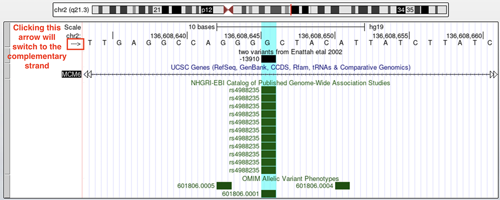 Figure 3. The -13910 allele on the top strand of the genome assembly. Clicking on the boxed arrow will switch to the complementary strand.