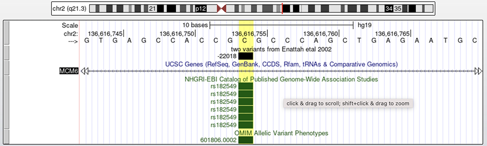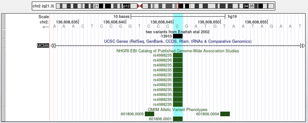 Figure 8. The -22018 allele is found on the "two variants from Enattah etal 2002" track. Below the "UCSC Genes" track, which shows a section of intron 9 on MCM6, is the "GWAS" track and the "OMIM" track, respectively.
