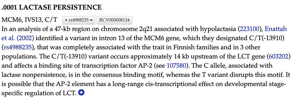 Clicking on the linked text "601806.0001" will bring you to the OMIM database, specifically a page detailing this SNV's association with lactase persistence (Figure 6). This page cites the Enattah et al. publication previously mentioned as the research that confirmed -13910's involvement in LP. -13910"s causation of LP is confirmed through this OMIM page; this variant "affects a binding site of transcription factor AP-2" and, therefore, plays a pivotal role in an adult individual's ability to digest lactose.