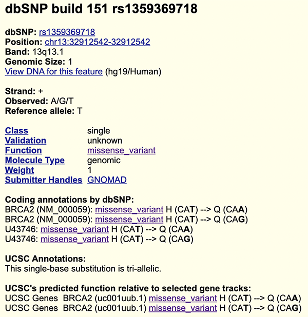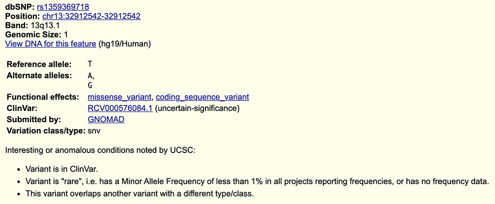 In Figures 1 and 2, the "UCSC Genes" track is displaying exon 11 of the BRCA2 gene. Below the "UCSC Genes" track are two "dbSNP" tracks, "dbSNP153" (upper) and "dbSNP151" (lower); these two tracks are different iterations of the same rsIDs and data, with some differences between the two data releases. The two tracks have different details available when clicking on one track or the other. Checking both versions of the rsID, or "reference SNP" can provide a wide range of insight into a variant.