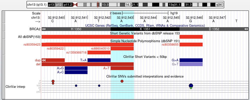 In Figures 1 and 2, the "UCSC Genes" track is displaying exon 11 of the BRCA2 gene. Below the "UCSC Genes" track are two "dbSNP" tracks, "dbSNP153" (upper) and "dbSNP151" (lower); these two tracks are different iterations of the same rsIDs and data, with some differences between the two data releases. The two tracks have different details available when clicking on one track or the other. Checking both versions of the rsID, or "reference SNP" can provide a wide range of insight into a variant.